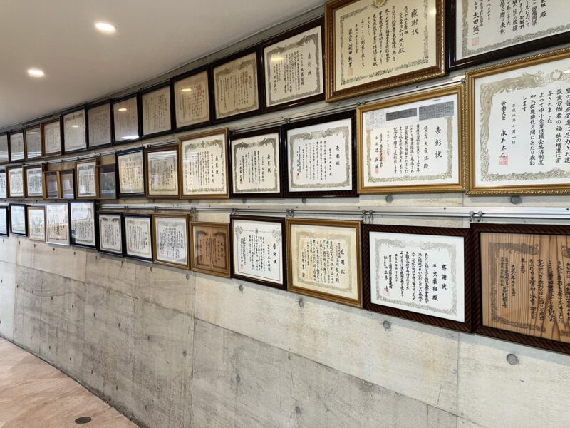 これまでにいただいた表彰状や感謝状などを、本社廊下に一部飾っています
